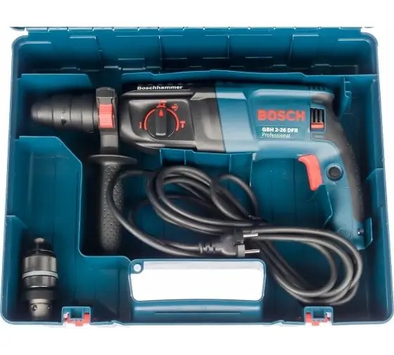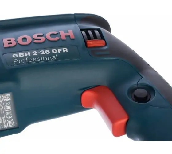 Bosch GBH 2-26 DFR perforator. Beton, polad və taxta ilə işləmək üçün istifadə olunur. Yüksək qazma sürətinə malikdir – 0-900 rpm. O, üç rejimdə işləyir – qazma, kəsmə və zərbəli qazma. SDS-plus çubuq tez və asanlıqla tez açılan çuxura dəyişdirilə bilər.